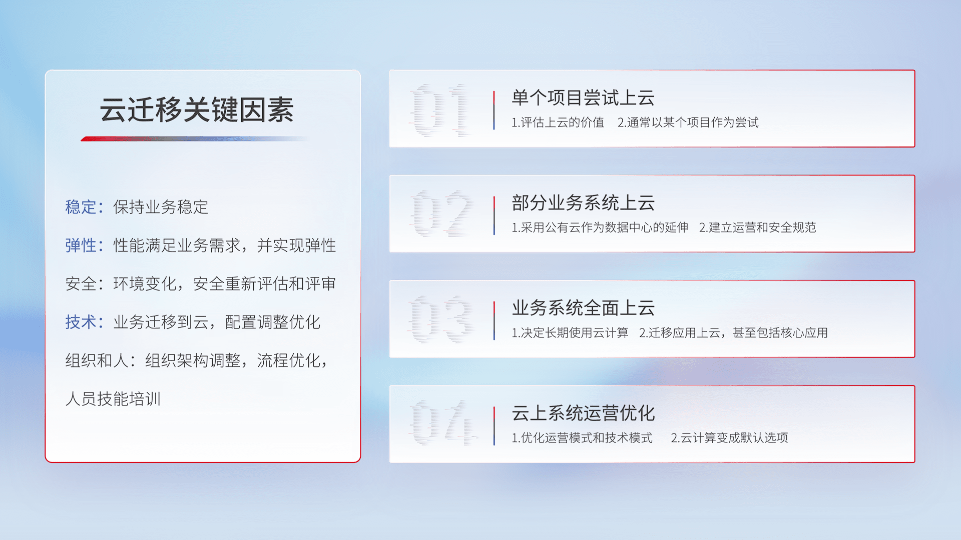 结合实际业务,,,从规划设计、、、云平台选型、、云原生改造、、、、数据迁移、、、、集成交付,,,,迁移全过程为客户识别最佳上云路径,,,做好风险识别管理,,,,设计网络架构、、身份权限、、、、安全审计合规、、、、操作审计、、日志审计、、、、监控告警策略、、、多站点容灾设计等,,,对云上基础设施进行整体规划,,,提升IT治理水平,,,,以满足弹性、、、、高可用、、、、高性能的需求。。