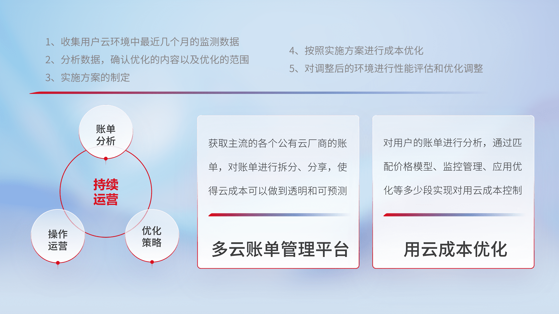 通过多云纳管,,以统一的资源数据模型把客户的云资源进行抽象和封装,,,进而实现对多云资源的统一操作,,保障云资源管理的可靠性、、稳定性与可用性。。。量身定制化运维内容,,配置、、、、开发运维、、补丁管理、、备份、、监控、、、、认证和访问管理、、审计和日常巡检等,,保障在用云过程中的可靠度,,稳定度以及高可用率。。
